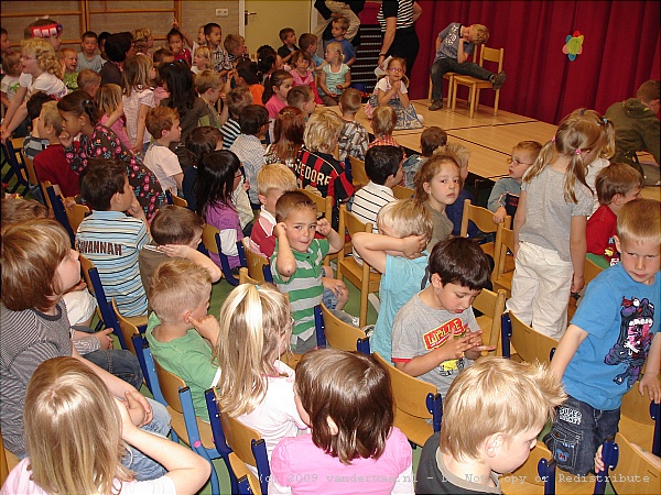 24 april 2009; Thom heeft met zijn klas en klas 1-2 een podiumoptreden. Bas zit in het publiek.