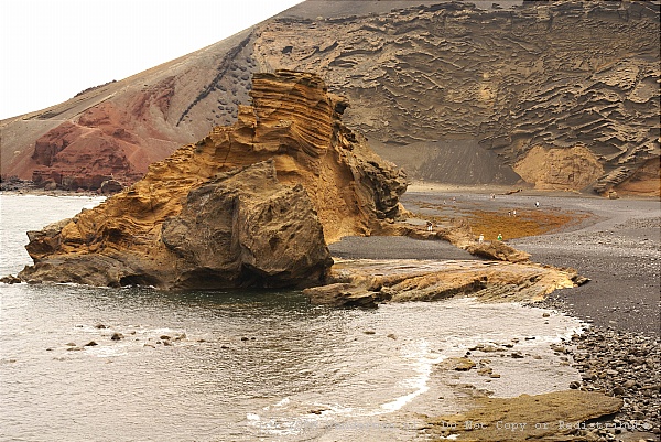 Zand is er nauwelijks. Hier aan de westzijde van het eiland is het vooral zwartte kiezeltjes