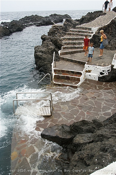 Het ligt aan de bonkige rotskust en langs die kust zijn een soort kommen en gaten in de lavarots uitgesleten