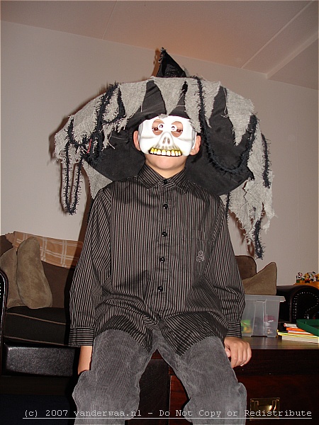 Gewapend met skeletmasker en tovenaarshoed op pad.